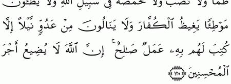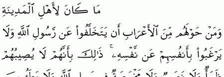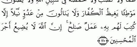 م ا ك ان لأ ه ل ال م د ين ة و م ن ح و ل ه م م ن الأ ع ر اب أ ن ي ت خ ل ف وا ع ن ر س ول الله و لا ي ر غ ب وا ب أ ن ف س ه م ع ن ن ف س ه ذ ل ك ب أ ن ه م لا ي ص يب ه م ظ م أ و لا ن ص ب و لا. مهما بدا للإنسان العمل صغيرا فهو عند الله محفوظ. إن الله لا يضيع أجر المحسنين. م ن ع د و ن ي ل ا إ لا ك ت ب ل ه م ب ه ع م ل صال ح إ ن الل ه لا ي ض يع أ ج ر ال م ح س ن ين 120.