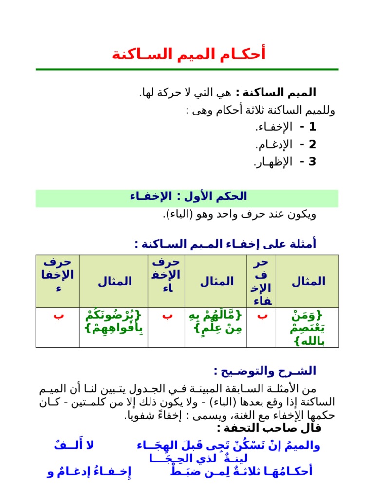 أحكام النون الساكنة والتنوين. أمثلة على حرف الإخفاء الشفوي من كلمتين. وسواء وقعت في فعل أو في اسم أو في حرف متوس طة أو متطر فة لها ثلاثة أحكام هي. الميم الساكنة هي الميم الخالية من الحركة أي التي لا حركة لها والتي يكون سكونها ثابتا في الوصل والوقف وتقع غالبا قبل جميع حروف العربية عدا حروف المد الثلاثة حتى لا يلتقي ساكنين وللميم الساكنة ثلاثة أحكام دون النظر.